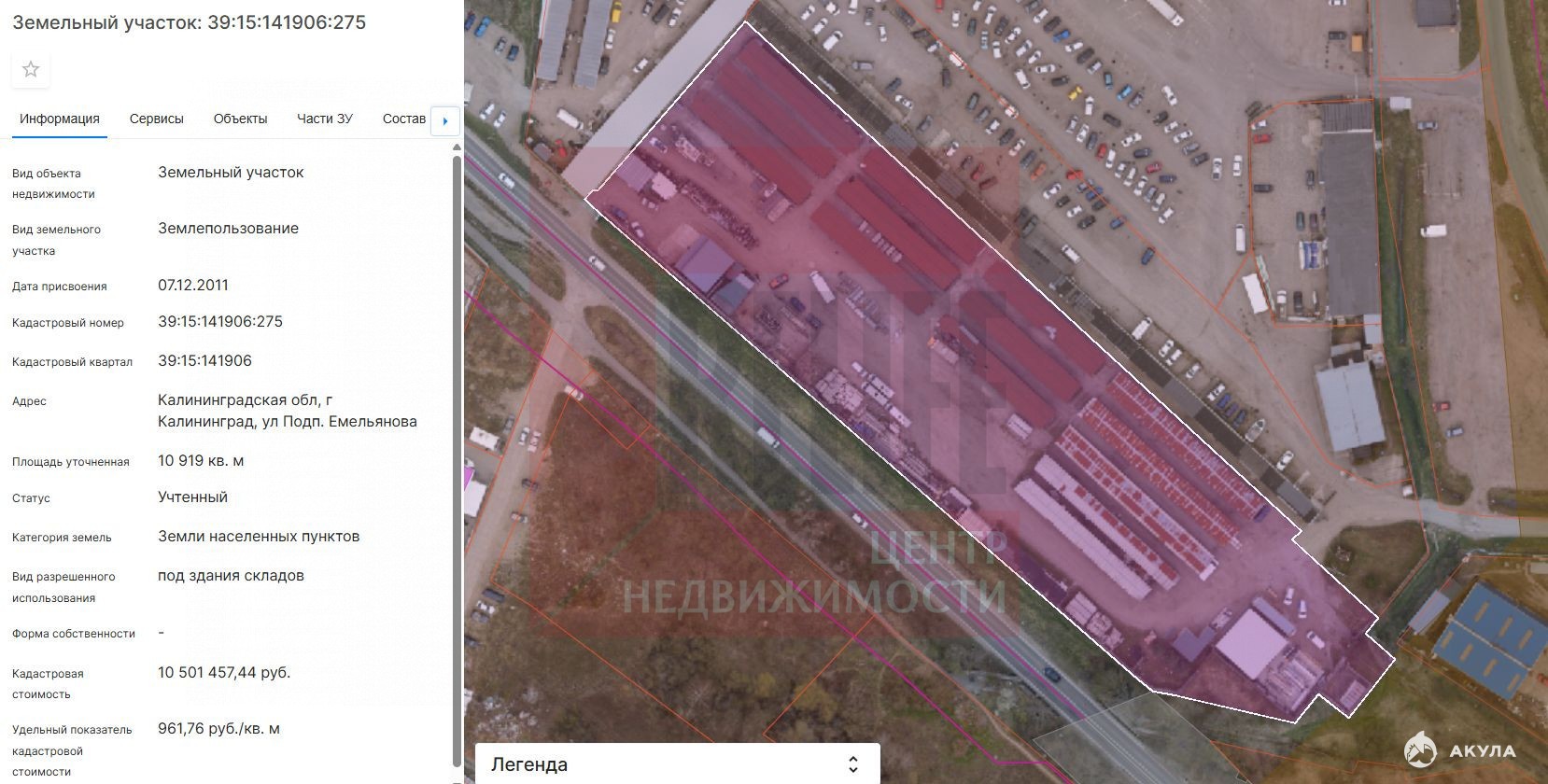 Кадастровый номер: 39:15:141906:275Площадь: 10919 кв. м (1, 09 Га). Локация: г. Калининград, ул. Подполковника Емельянова.Зона: П4 (Коммунально-складская зона) Аренда до 2049 года