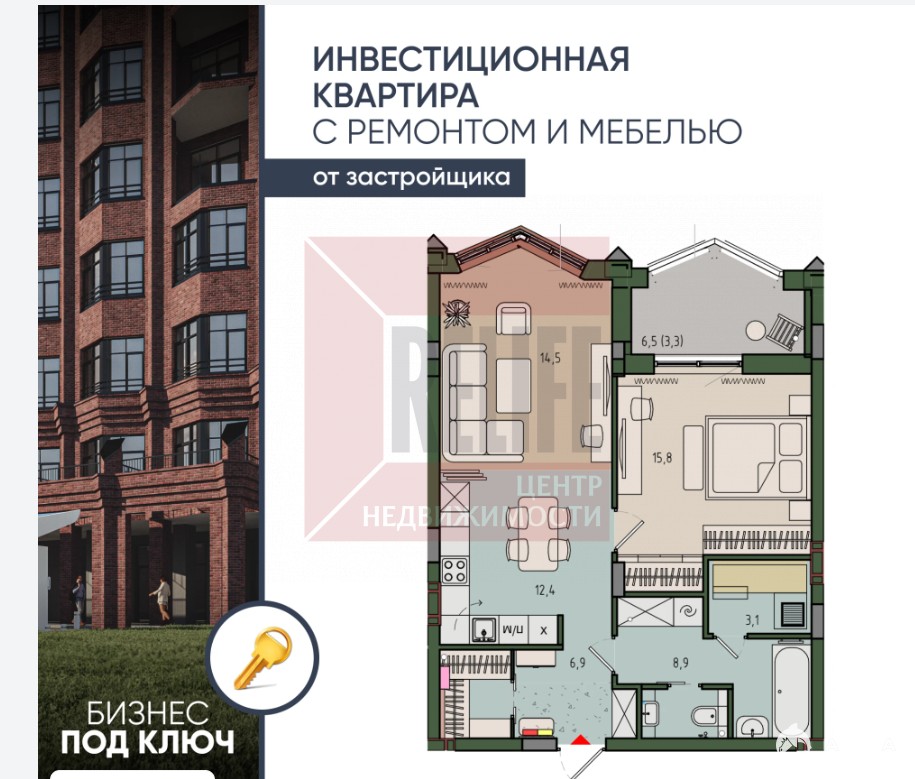 Площадь: 64, 9 м² (жилая — 15, 8 м², кухня — 26, 9 м²)