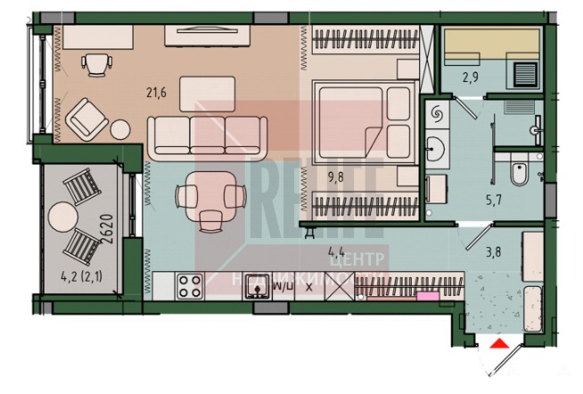 Площадь: 50, 9 м² (жилая — 9, 9 м², кухня — 21, 8 м²)