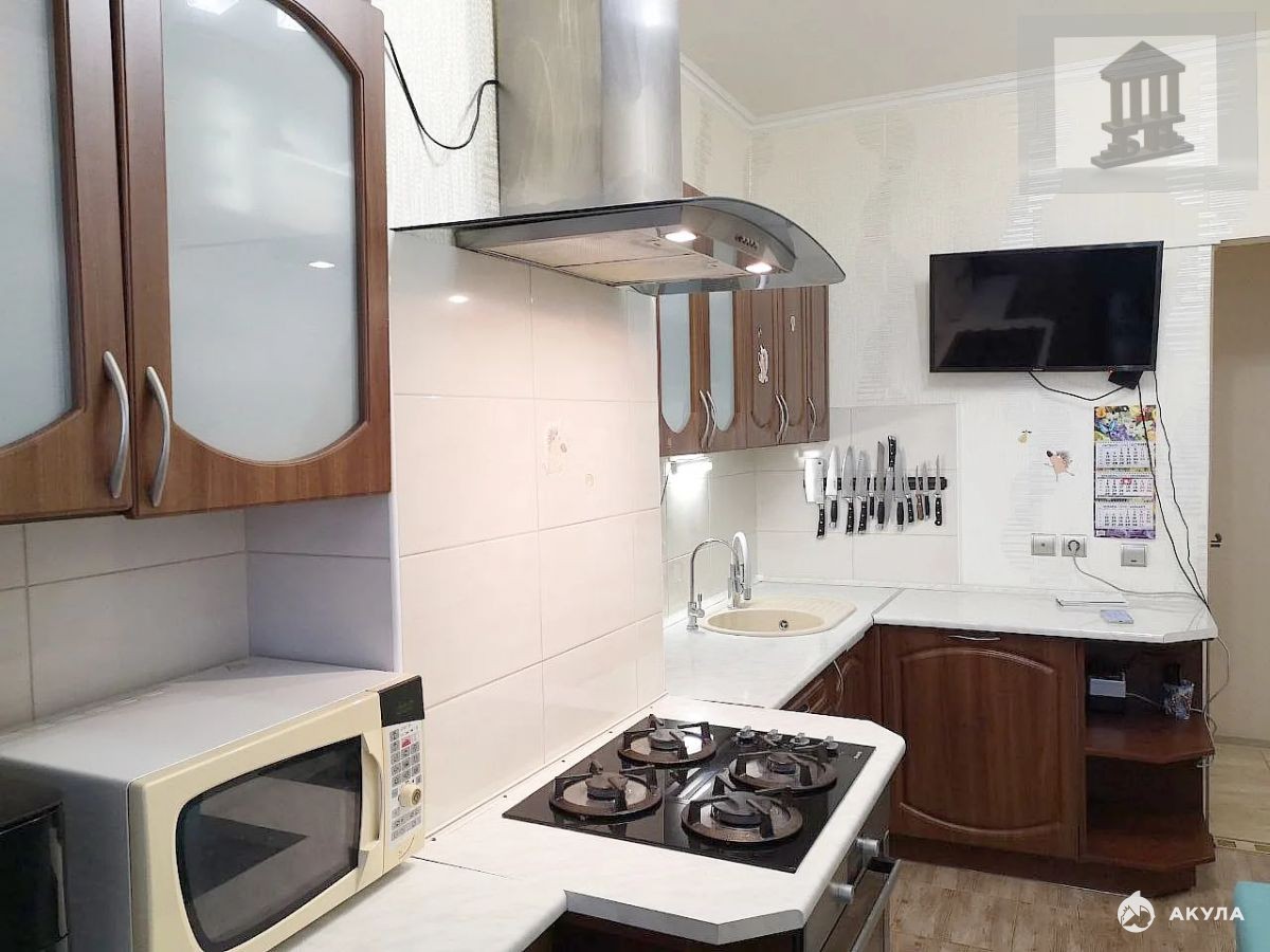 Состояние: выполнен качественный ремонт: добротный ламинат, кафель, зеркальные распашные межкомнатные двери, встроенная кухня, оборудованная гардеробная.