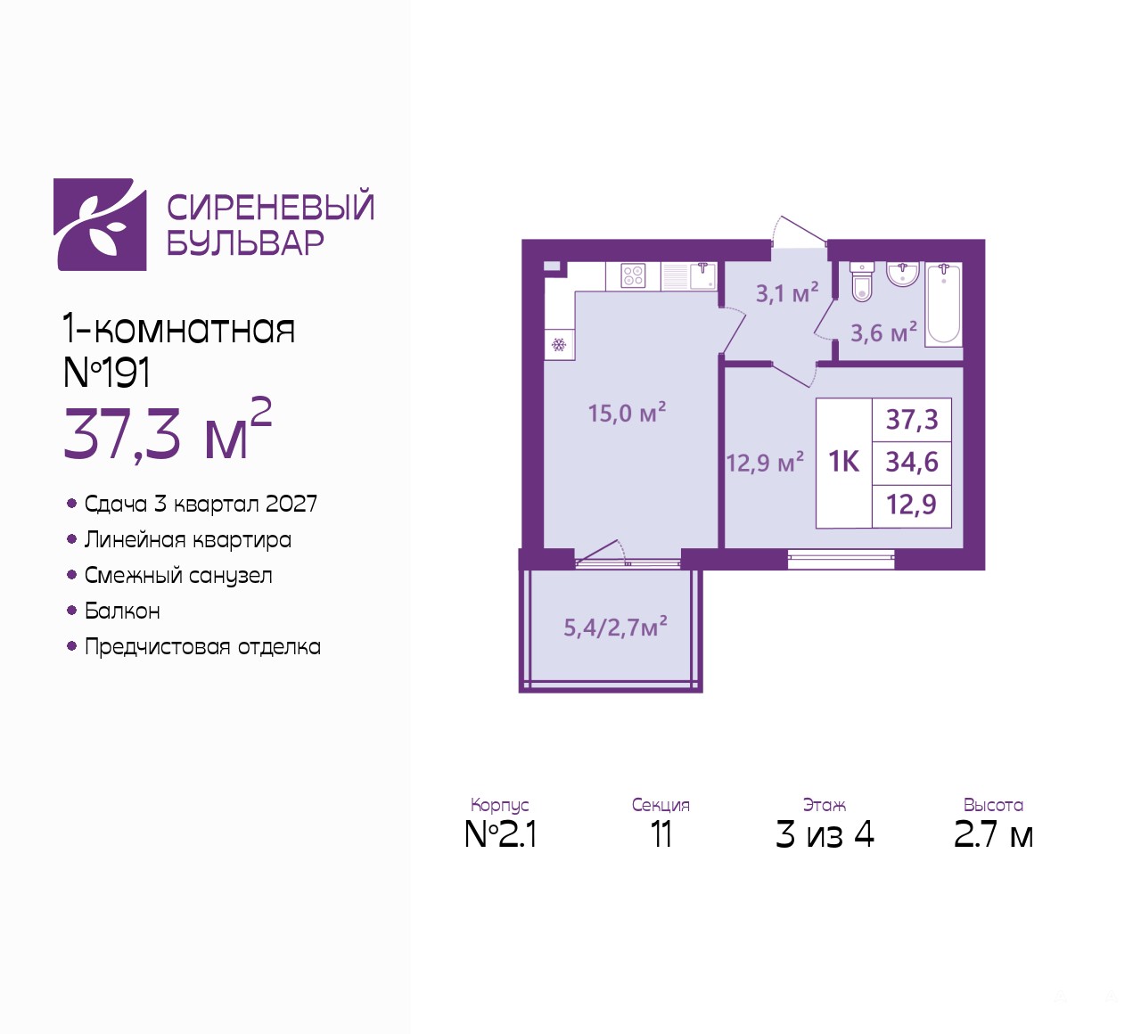 Однокомнатная квартира с предчистовой отделкой в ЖК "Сиреневый бульвар" на 3 этаже. Общая площадь: 37.3 кв.м., жилая: 12.9 кв.м., площадь просторной кухни-столовой: 15 кв.м. Все окна выходят на одну сторону. В квартире один балкон, один совмещенный санузел. Высота потолков 2.7 м.