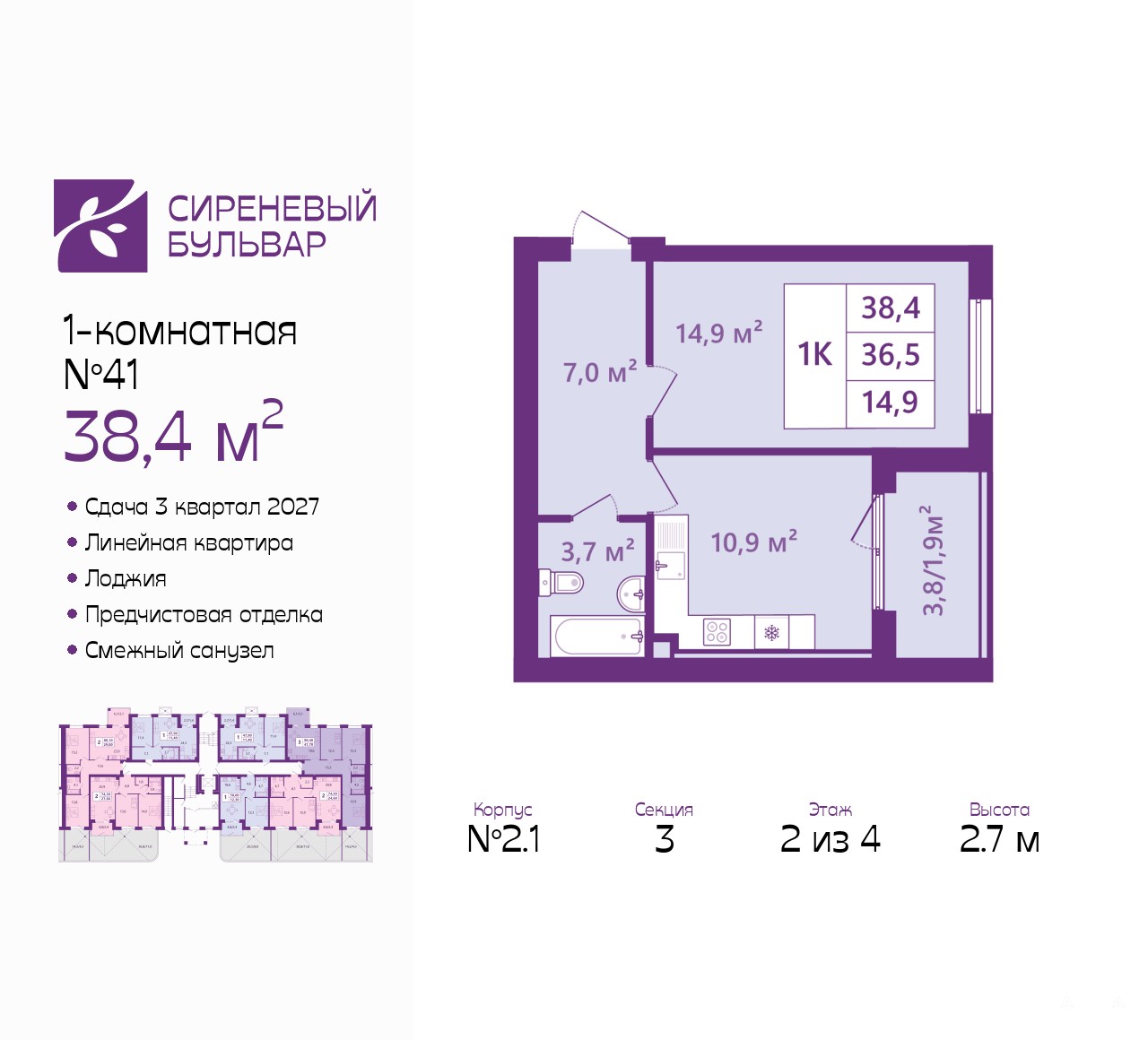1-комн. квартира от застройщика с предчистовой отделкой в ЖК "Сиреневый бульвар" на 2 этаже. Общая площадь: 38.4 кв.м., жилая: 14.9 кв.м., площадь просторной кухни-столовой: 10.9 кв.м. Все окна выходят на одну сторону. В квартире одна лоджия, один совмещенный санузел. Высота потолков 2.7 м.