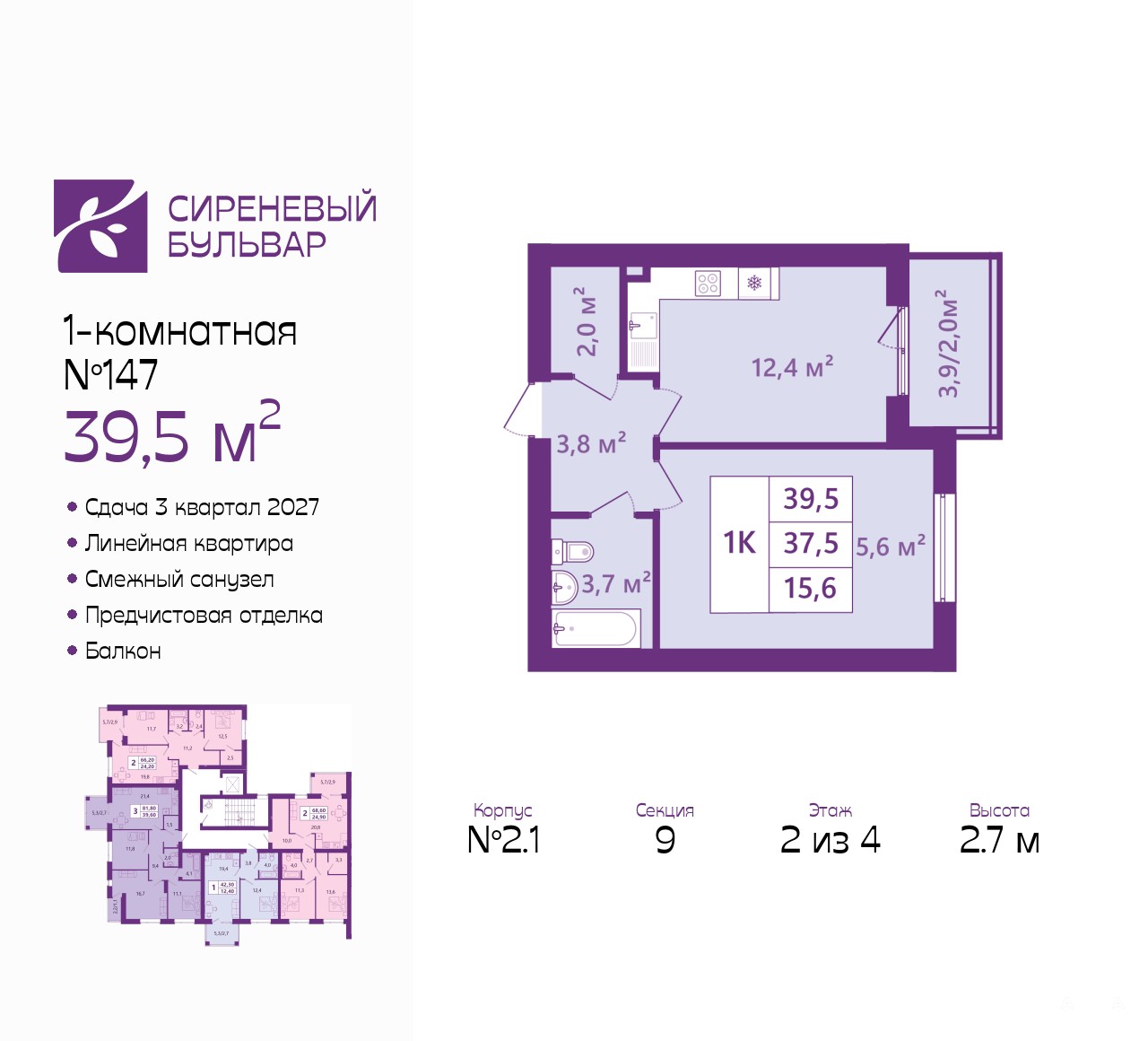 Продается однокомнатная квартира от застройщика с предчистовой отделкой в ЖК "Сиреневый бульвар" на 2 этаже. Общая площадь: 39.5 кв.м., жилая: 15.6 кв.м., площадь просторной кухни-столовой: 12.4 кв.м. Все окна выходят на одну сторону. В квартире один балкон, один совмещенный санузел. Высота потолков 2.7 м.