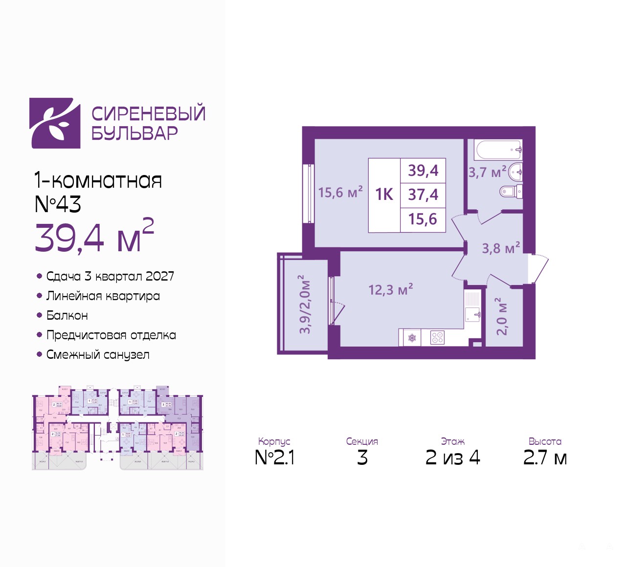 1-комн. квартира с предчистовой отделкой в ЖК "Сиреневый бульвар" на 2 этаже. Общая площадь: 39.4 кв.м., жилая: 15.6 кв.м., площадь просторной кухни-столовой: 12.3 кв.м. Все окна выходят на одну сторону. В квартире один балкон, один совмещенный санузел. Высота потолков 2.7 м.