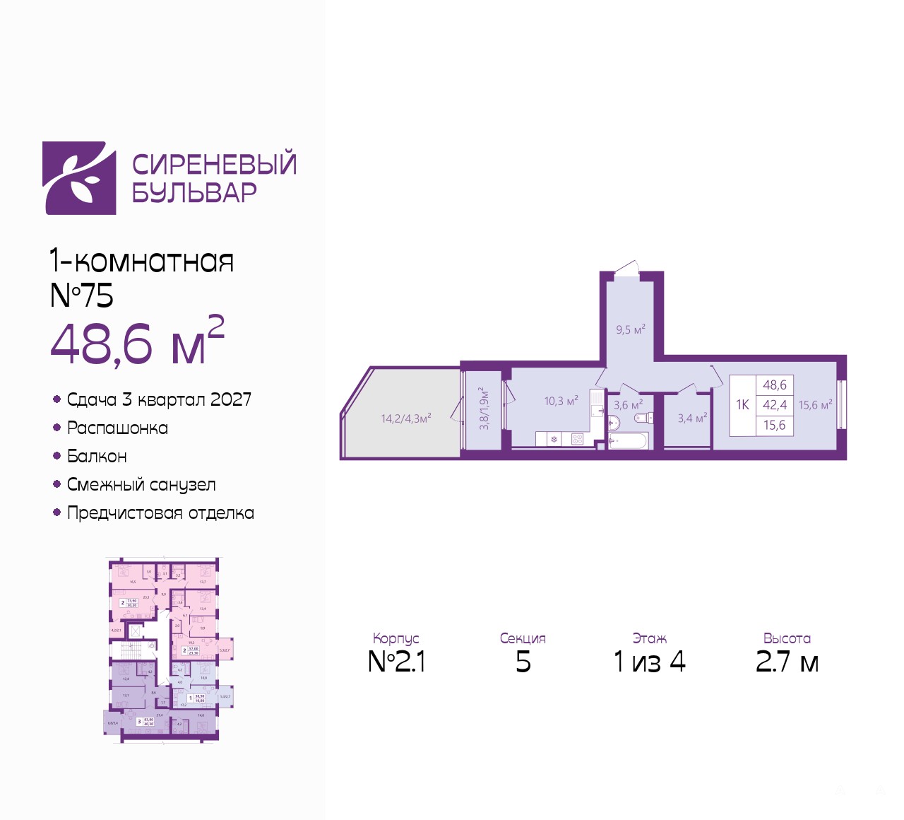 Просторная 1-комн. квартира с предчистовой отделкой в ЖК "Сиреневый бульвар" на 1 этаже. Общая площадь: 48.6 кв.м., жилая: 15.6 кв.м., площадь просторной кухни-столовой: 10.3 кв.м. Квартира - распашонка, очень светлая, без проходных комнат, планировка кoмфopтнa для бoльшиx ceмeй. В квартире один балкон, один совмещенный санузел. Наличие террасы в квартире дает возможность для создания зон отдыха в кругу семьи и друзей. Высота потолков 2.7 м.