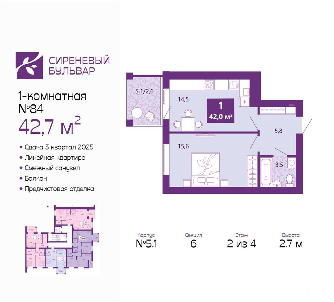 ID в ИМЛС: 47211539 Офис продаж ЖК "Сиреневый бульвар". Комнаты - раздельные. предчистовая. Серия дома - Индивидуальный проект. Однокомнатная квартира от застройщика с предчистовой отделкой в ЖК "Сиреневый бульвар" на 2 этаже. Общая площадь: 42.7 кв.м., жилая: 15.6 кв.м., площадь просторной кухни-столовой: 14.5 кв.м. Все окна выходят на одну сторону. В квартире один балкон, один совмещенный санузел. Высота потолков 2.7 м.