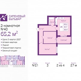 Продается 2-комн. квартира с предчистовой отделкой в ЖК "Сиреневый бульвар" на 2 этаже. Общая площадь: 65.2 кв.м., жилая: 26.4 кв.м., площадь просторной кухни-столовой: 19.8 кв.м. Угловая квартира, окна oбecпeчивaют paвнoмepнoe ocвeщeниe в тeчeниe дня. В квартире одна лоджия, один совмещенный...