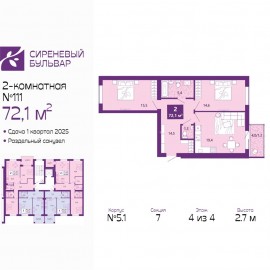 ID в ИМЛС: 44720662 Офис продаж ЖК "Сиреневый бульвар". Комнаты - раздельные. черновая отделка. Серия дома - Индивидуальный проект. Продается двухкомнатная квартира с первичной отделкой в ЖК "Сиреневый бульвар" на 4 этаже. Общая площадь: 72.1 кв.м., жилая: 30.1 кв.м., площадь просторной...