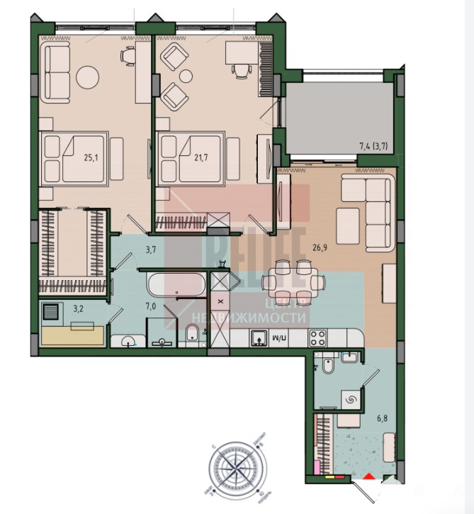 Площадь: 100, 7 м² (жилая — 46, 8 м², кухня — 25, 4 м²)