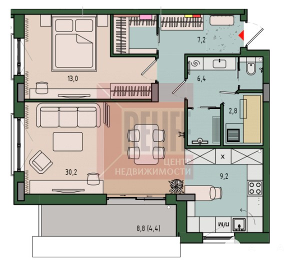Площадь: 65, 9 м² (жилая — 43, 2 м², кухня — 9, 2 м²)
