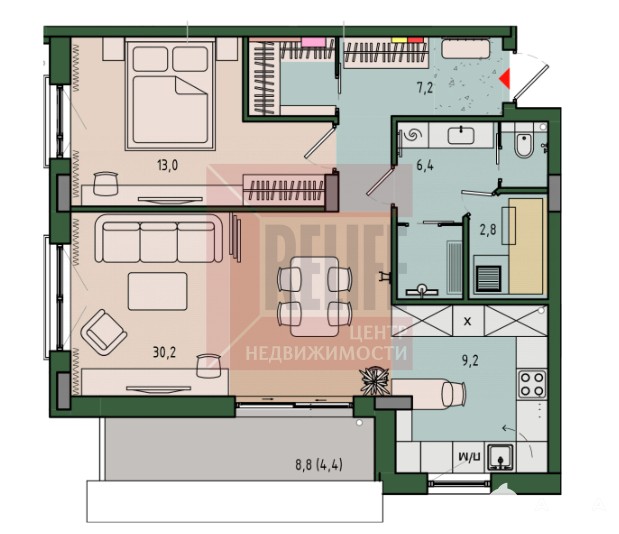 Площадь: 65, 8 м² (жилая — 43, 2 м², кухня — 9, 2 м²)
