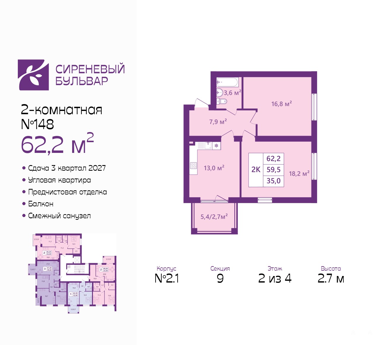Двухкомнатная квартира с предчистовой отделкой в ЖК "Сиреневый бульвар" на 2 этаже. Общая площадь: 62.2 кв.м., жилая: 35.3 кв.м., площадь просторной кухни-столовой: 13 кв.м. Квартира угловая, очень светлая, естественная вентиляция при открытии окон. В квартире один балкон, один совмещенный санузел. Высота потолков 2.7 м.