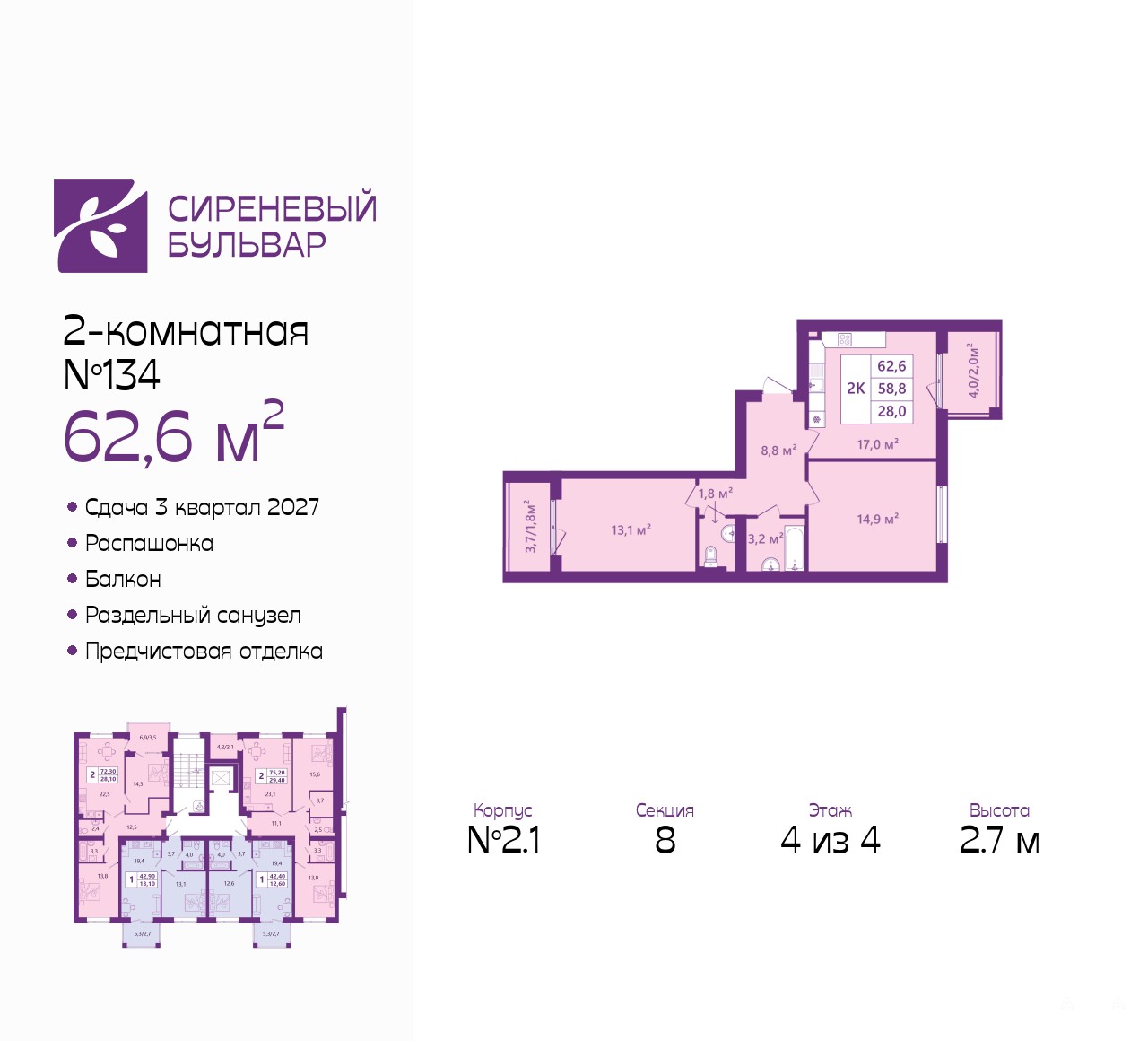Дом монолитный, многоподъездный, высотой 4 этажа. Квартира находится в 8-й секции в корпусе 2.1. На этаже 3 квартиры. В подъезде 1 грузовой лифт. Окончание строительства - 3 квартал 2027 года. Оформление сделки по договору долевого участия.