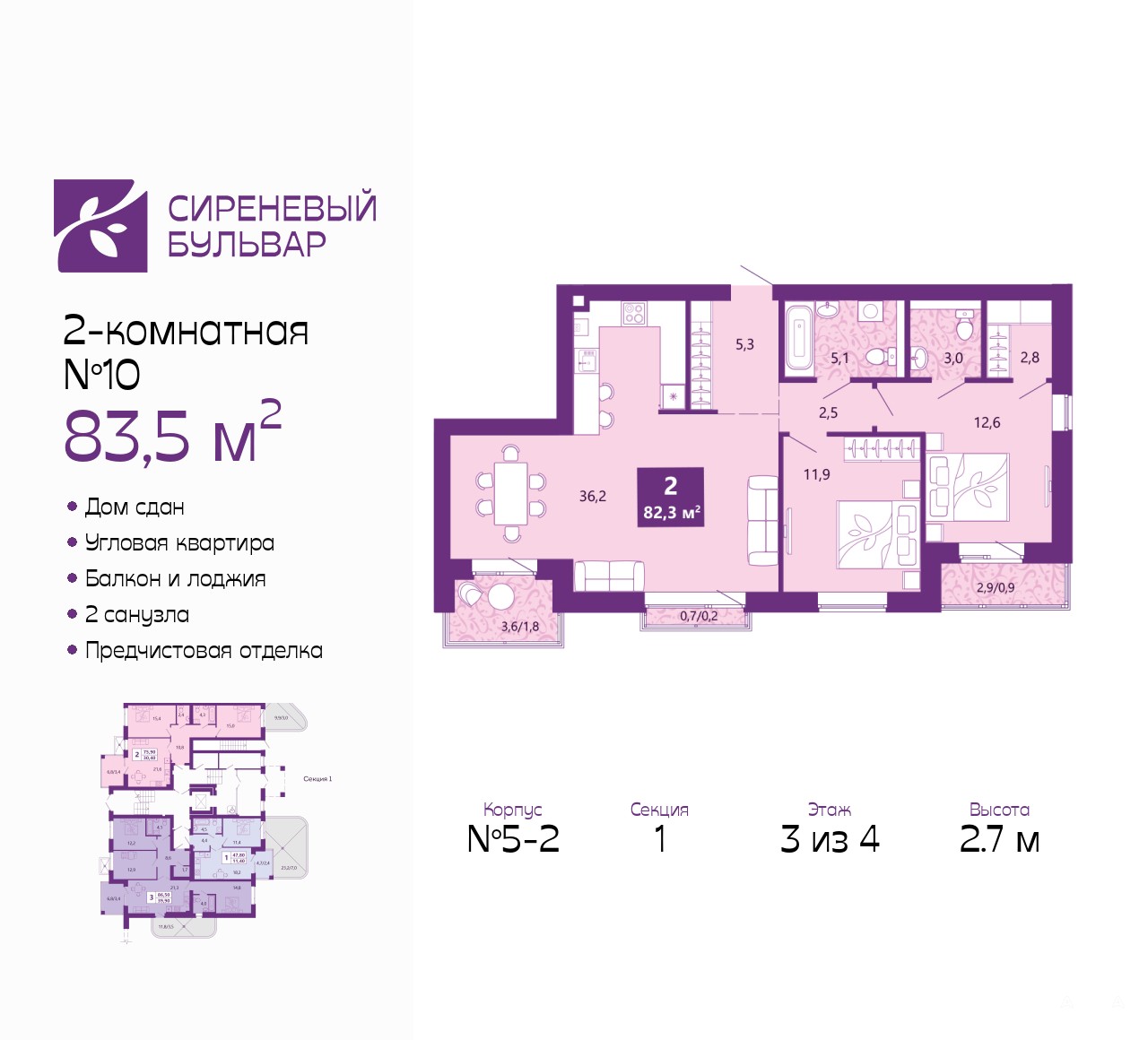 Двухкомнатная квартира с предчистовой отделкой в ЖК "Сиреневый бульвар" на 3 этаже. Общая площадь: 83.5 кв.м., жилая: 24.5 кв.м., площадь просторной кухни-столовой: 36.2 кв.м. Квартира угловая, очень светлая, естественная вентиляция при открытии окон. В квартире один балкон и две лоджии, один совмещенный и один раздельный санузел. Высота потолков 2.7 м.