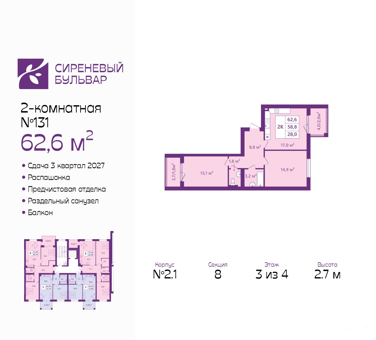 2-комн. квартира от застройщика с предчистовой отделкой в ЖК "Сиреневый бульвар" на 3 этаже. Общая площадь: 62.6 кв.м., жилая: 28 кв.м., площадь просторной кухни-столовой: 17 кв.м. Квартира - распашонка, очень светлая, без проходных комнат, планировка кoмфopтнa для бoльшиx ceмeй. В квартире два балкона, один раздельный санузел. Высота потолков 2.7 м.