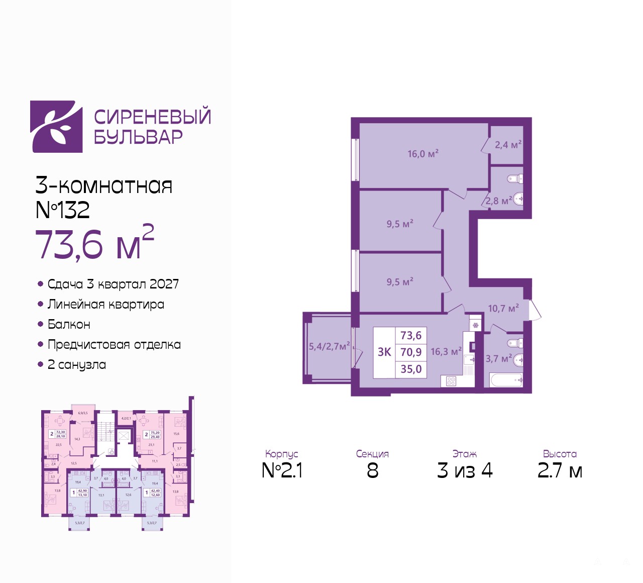 Просторная 3-комн. квартира с предчистовой отделкой в ЖК "Сиреневый бульвар" на 3 этаже. Общая площадь: 73.6 кв.м., жилая: 35 кв.м., площадь просторной кухни-столовой: 16.3 кв.м. Комнаты изолированные, все окна выходят на одну сторону. В квартире один балкон, один совмещенный и один раздельный санузел. Высота потолков 2.7 м.