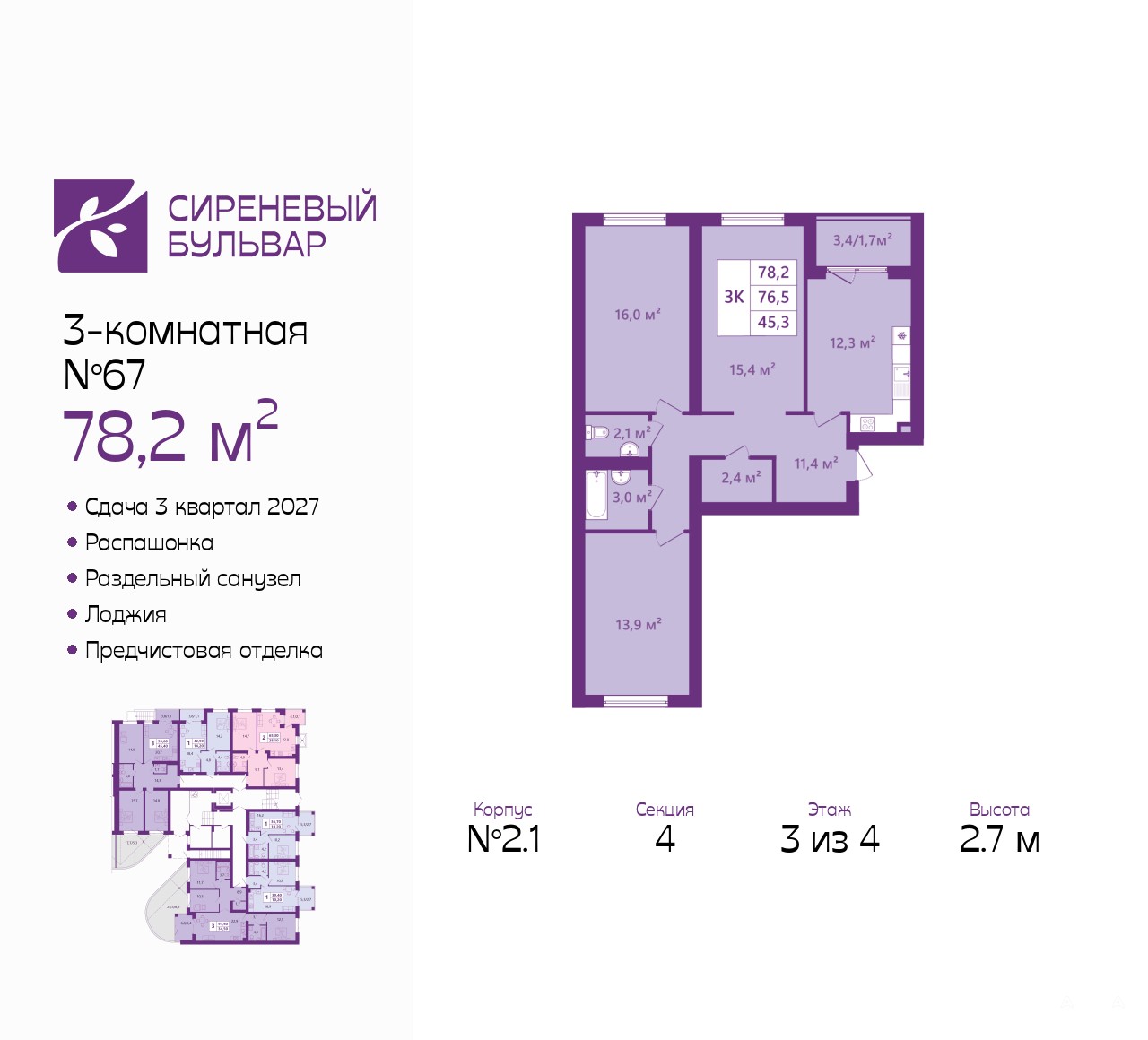 3-комн. квартира от застройщика с предчистовой отделкой в ЖК "Сиреневый бульвар" на 3 этаже. Общая площадь: 78.2 кв.м., жилая: 45.3 кв.м., площадь просторной кухни-столовой: 12.3 кв.м. Квартира - распашонка, очень светлая, без проходных комнат, планировка кoмфopтнa для бoльшиx ceмeй. В квартире одна лоджия, один раздельный санузел. Высота потолков 2.7 м.
