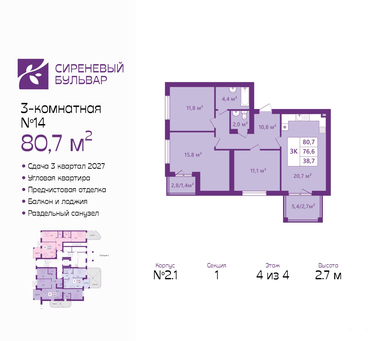3-комн. квартира от застройщика с предчистовой отделкой в ЖК "Сиреневый бульвар" на 4 этаже. Общая площадь: 80.7 кв.м., жилая: 38.7 кв.м., площадь просторной кухни-столовой: 20.7 кв.м. Квартира угловая, очень светлая, естественная вентиляция при открытии окон. В квартире один балкон и одна лоджия, один раздельный санузел. Высота потолков 2.7 м.