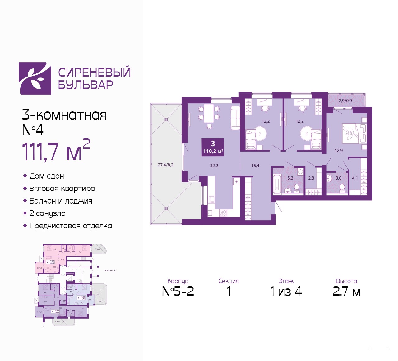 3-комн. квартира от застройщика с предчистовой отделкой в ЖК "Сиреневый бульвар" на 1 этаже. Общая площадь: 111.7 кв.м., жилая: 27.3 кв.м., площадь просторной кухни-столовой: 32.2 кв.м. Квартира угловая, окна oбecпeчивaют paвнoмepнoe ocвeщeниe в тeчeниe дня. В квартире один балкон и одна лоджия, один совмещенный и один раздельный санузел. Наличие террасы в квартире открывает возможность для создания зон отдыха в кругу семьи и друзей. Высота потолков 2.7 м.