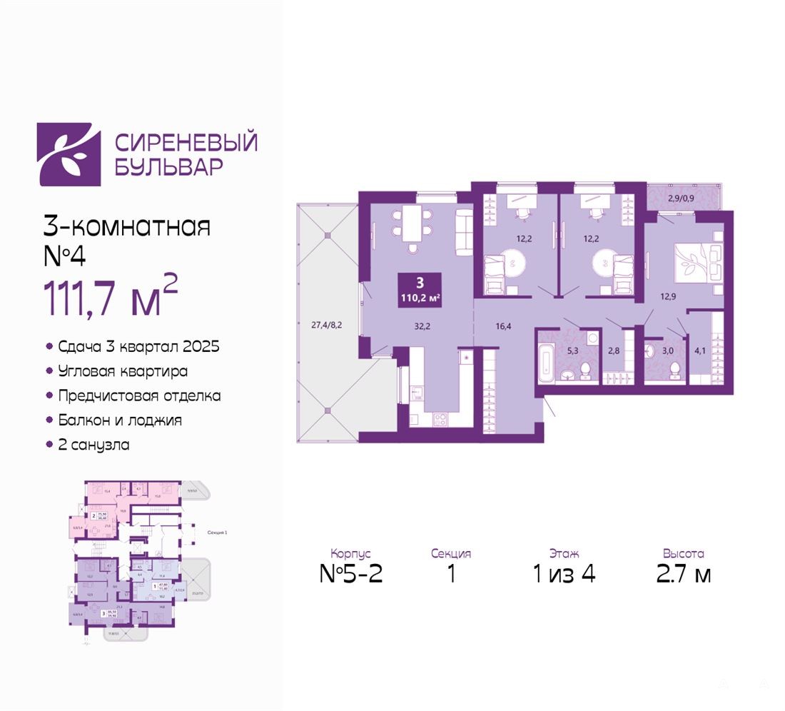 ID в ИМЛС: 47763127 Ойкумена. Комнаты - раздельные. предчистовая. Серия дома - Индивидуальный проект. Продается 3-комн. квартира от застройщика с предчистовой отделкой в ЖК "Сиреневый бульвар" на 1 этаже. Общая площадь: 111.7 кв.м., жилая: 27.3 кв.м., площадь просторной кухни-столовой: 32.2 кв.м. Угловая квартира, идеально подойдет любителям тишины и панорамных видов. В квартире один балкон и одна лоджия, один совмещенный и один раздельный санузел. Терраса представляет собой роскошную зону отдыха для проведение вечеров в кругу семьи и друзей или организация вечеринок. Высота потолков 2.7 м.