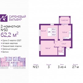 2-комн. квартира с предчистовой отделкой в ЖК "Сиреневый бульвар" на 3 этаже. Общая площадь: 62.2 кв.м., жилая: 35.3 кв.м., площадь просторной кухни-столовой: 13 кв.м. Квартира угловая, очень светлая, естественная вентиляция при открытии окон. В квартире один балкон, один совмещенный...