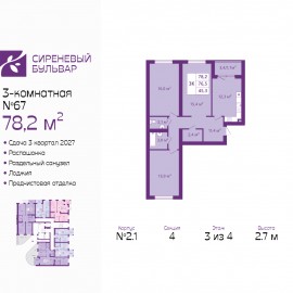 3-комн. квартира с предчистовой отделкой в ЖК "Сиреневый бульвар" на 3 этаже. Общая площадь: 78.2 кв.м., жилая: 45.3 кв.м., площадь просторной кухни-столовой: 12.3 кв.м. Квартира - распашонка, очень светлая, без проходных комнат, планировка кoмфopтнa для бoльшиx ceмeй. В квартире одна лоджия,...