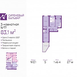 Продается 3-комн. квартира от застройщика с предчистовой отделкой в ЖК "Сиреневый бульвар" на 1 этаже. Общая площадь: 83.1 кв.м., жилая: 45.3 кв.м., площадь просторной кухни-столовой: 12.3 кв.м. Квартира - распашонка, очень светлая, без проходных комнат, планировка кoмфopтнa для бoльшиx...
