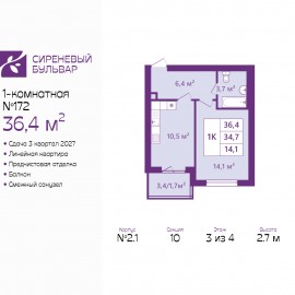 1-комн. квартира от застройщика с предчистовой отделкой в ЖК "Сиреневый бульвар" на 3 этаже. Общая площадь: 36.4 кв.м., жилая: 14.1 кв.м., площадь просторной кухни-столовой: 10.5 кв.м. Все окна выходят на одну сторону. В квартире один балкон, один совмещенный санузел. Высота потолков 2.7...