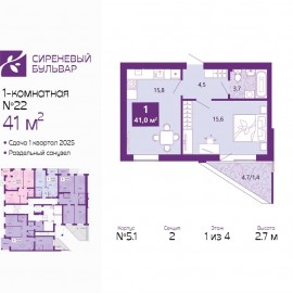ID в ИМЛС: 44720649 Офис продаж ЖК "Сиреневый бульвар". Комнаты - раздельные. черновая отделка. Серия дома - Индивидуальный проект. 1-комн. квартира с первичной отделкой в ЖК "Сиреневый бульвар" на 1 этаже. Общая площадь: 41 кв.м., жилая: 15.6 кв.м., площадь просторной кухни-столовой: 15.8...