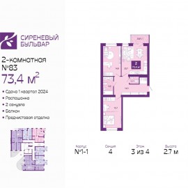 2-комн. квартира с предчистовой отделкой в ЖК "Сиреневый бульвар" на 3 этаже. Общая площадь: 83.5 кв.м., жилая: 24.5 кв.м., площадь просторной кухни-столовой: 36.2 кв.м. Угловая квартира, очень светлая, естественная вентиляция при открытии окон. В квартире один балкон и две лоджии, один...