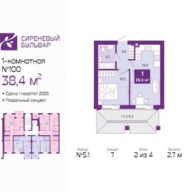 ID в ИМЛС: 44720772 Офис продаж ЖК "Сиреневый бульвар". Комнаты - раздельные. черновая отделка. Серия дома - Индивидуальный проект. 1-комн. квартира с первичной отделкой в ЖК "Сиреневый бульвар" на 2 этаже. Общая площадь: 38.4 кв.м., жилая: 10.5 кв.м., площадь просторной кухни-столовой: 16.9...
