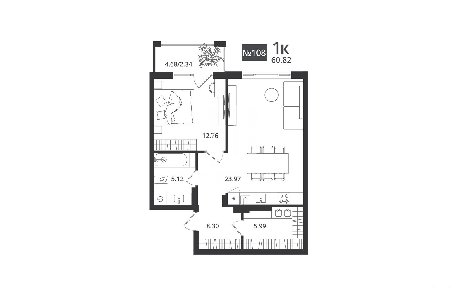 Спальная зона деликатно отделена от гостевой и обладает балконом. Окна квартиры выходят на юго-восточную сторону света.