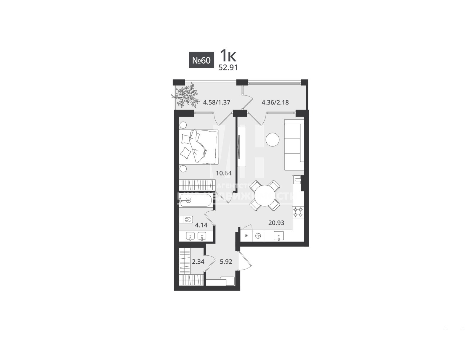 Удачное планировочное решение позволяет организовать комфортное пространство из видовой спальни и просторной кухни-гостиной площадью 20, 93 кв.м.