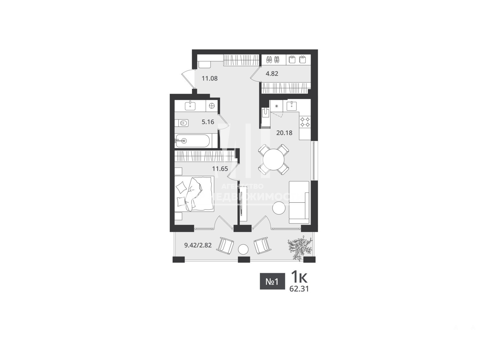 Удачное планировочное решение позволяет организовать комфортное пространство из видовой спальни и просторной кухни-гостиной площадью 20, 18 кв.м., выходящей на юго-западную сторону света (лесной массив и детскую площадку).